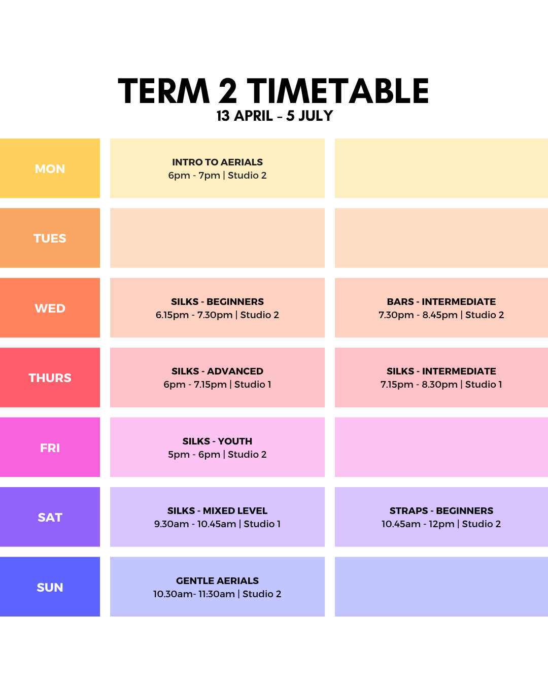 Please note, there will be no classes on national and regional public holidays, except Anzac day and King’s Birthday (6pm onwards).